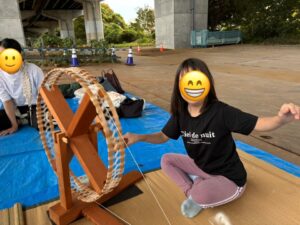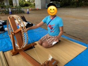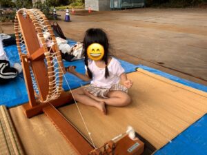 種を取り除いた綿を綿打ちしたものを糸にしていく体験です。