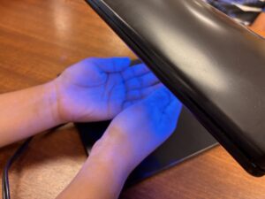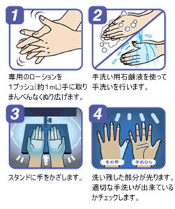 「手洗いチェッカー」は、専用のローションを手に塗ったあと、通常通りに手を洗い、その後ブラックライトを当てることで、洗い残しがどこにあるかを目で見て確認できるツールです。子どもたちにもわかりやすく、ゲーム感覚で楽しみながら、手洗いのポイントを学ぶことができますョ。