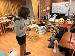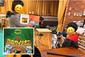まずはみんな集まって「ハロウィンナー(作・絵:デーヴ・ピルキー訳:かねはらみずひと)」の絵本を読み聞かせ。