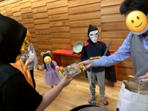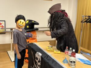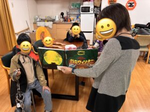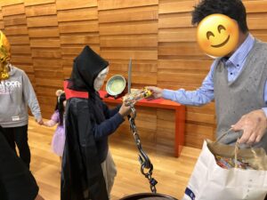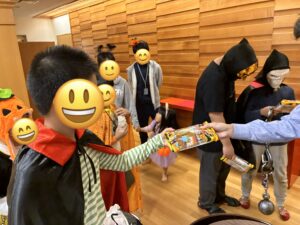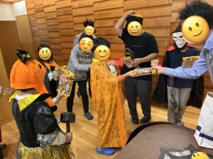 ハロウィン・パーティの最後はみんなで「トリック・オア・トリート!」のかけ声で施設長からお菓子をゲット!