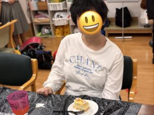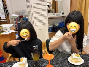 大きなケーキやジュースをサーブして、仲良く笑顔いっぱいのカフェになりました!