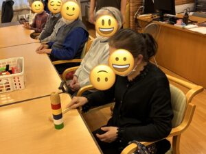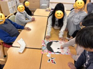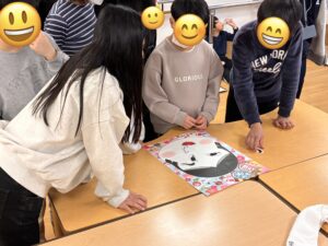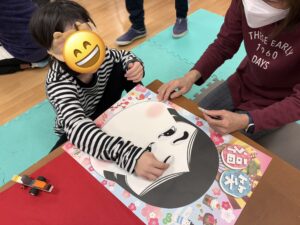 目隠しをして顔を完成させると、思わずみんなで大笑い。