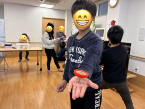 高齢者の方が昔の遊び方を教えてくださり、子ども達は真剣な表情で挑戦。うまく回ると「すごい!」「回った!」と歓声があがりました。