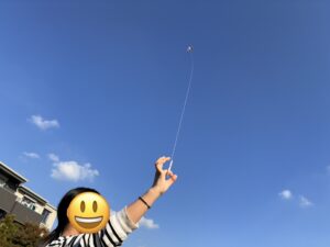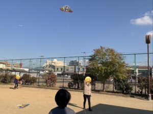 青空に高く揚がる凧を見て、子ども達も高齢者の方も自然と笑顔に。「もっと高く揚がったね!」と声をかけ合いながら、公園を元気に走り回っていました。