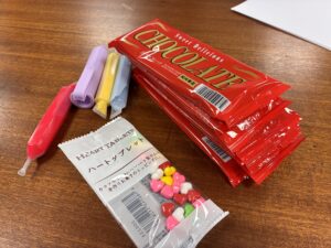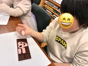 クローバー春日では、食育プログラムの一環として、バレンタイン・デーに向けて、板チョコをデコペンでデコレーションしました。