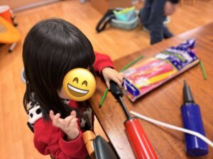 最初は風船が割れないか不安そうにする様子も見られましたが、少しずつ慣れてくると、自分なりに工夫をしながら楽しんで取り組む姿が見られました。