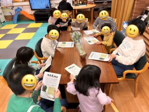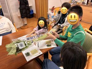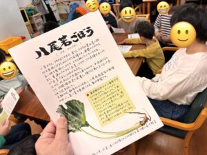 子どもたちは、わかごぼうを実際に手に取りながら「葉っぱも食べられるの?」「いいにおいがする!」と興味津々な様子でした。