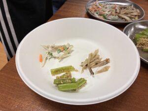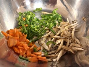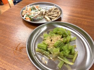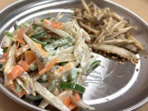 保育士スタッフが考えてくれたメニューは、「若こぼうの茎の含め煮」「ささがきのきんぴら」「ささがきとピーマン、人参の三色サラダ」です?