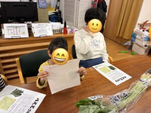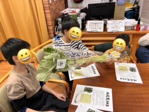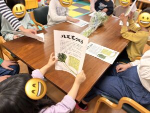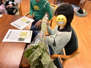 子どもたちは、わかごぼうを実際に手に取りながら「葉っぱも食べられるの?」「いいにおいがする!」と興味津々な様子でした。