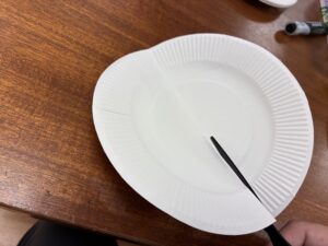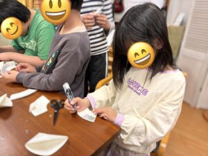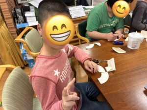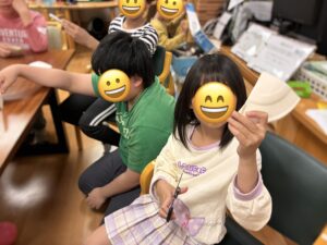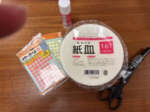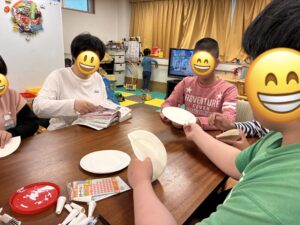 今回はあえて色を塗らず、まだ子ども日まで日にちがあるので、後で思い思い好みの色付けも出来るよう、白い紙皿をそのまま活かす事にしました。
