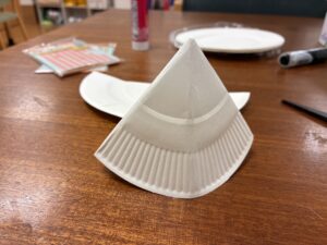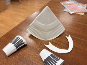 今回はあえて色を塗らず、まだ子ども日まで日にちがあるので、後で思い思い好みの色付けも出来るよう、白い紙皿をそのまま活かす事にしました。