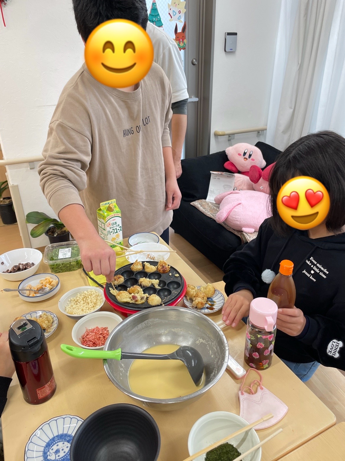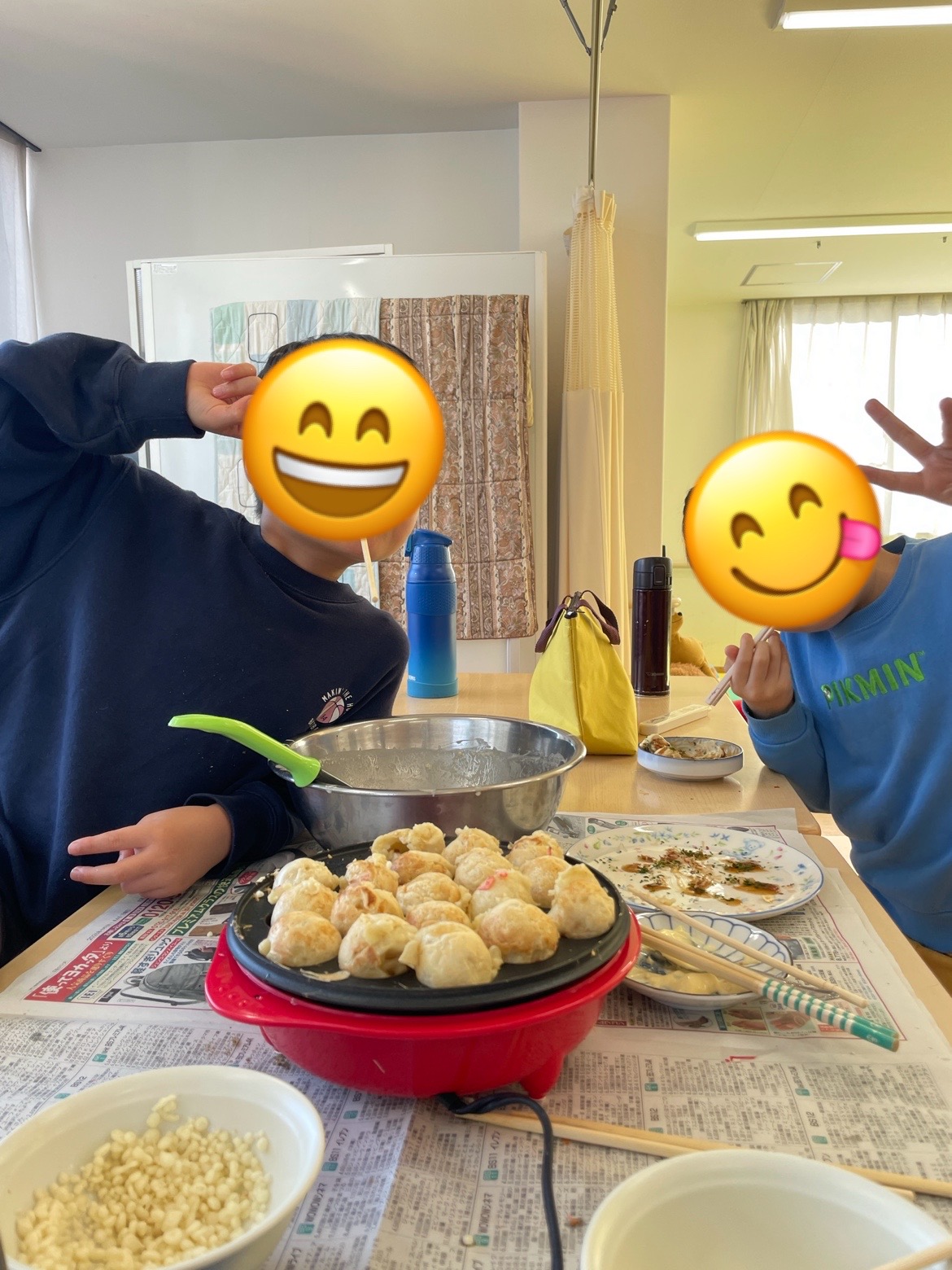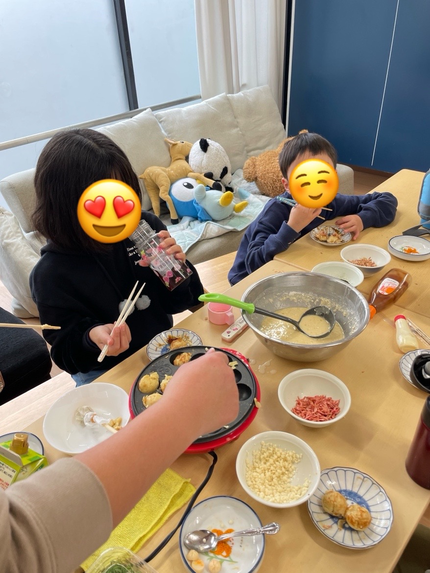 お楽しみ会をしました。 2026.01.28 クローバー お楽しみ会をしました。 自分たちでたこ焼き、うまくできるかな? 大きなお兄さんに、ひっくり返す見本を見せてもらって。 焼き上がりを狙っている人もいますね。 タコがいっぱい入っていてとてもおいしそう。 天かすや、青ノリ、とんかつソース、マヨネーズもかけるとおいしい。 とってもおいしいからこの笑顔。