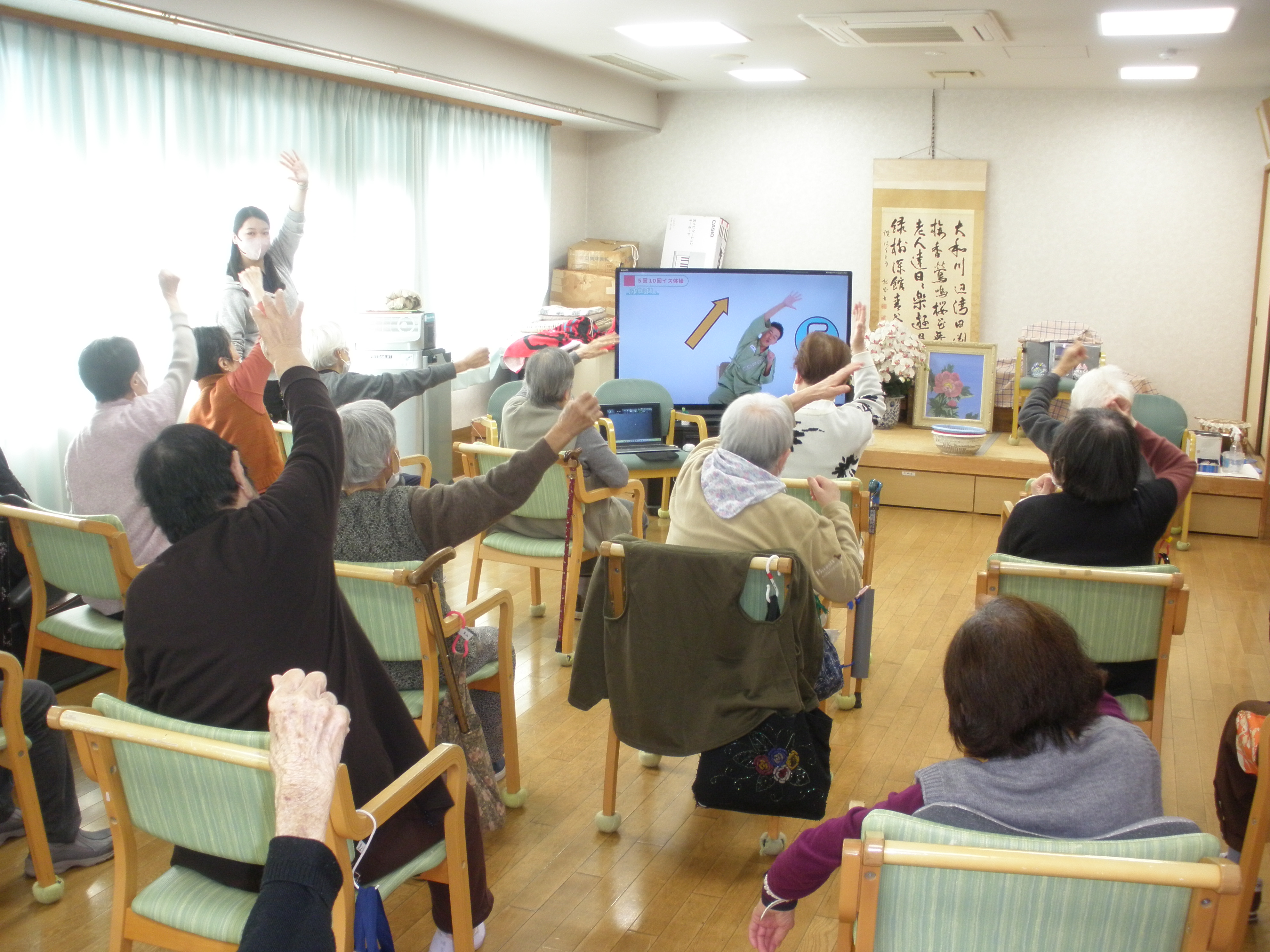 今日はグリーンデル柏原デイサービスセンターとはくとうデイサービスセンターの合同レクリエーションということで「ごぼう先生のオンライン体操」を楽しみました!